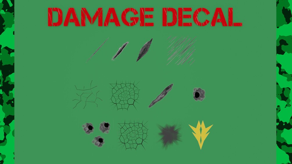 How to install: Download the provided .zip file, extract , copy and paste the folder titled "Damage_decals_vol1" into your decal machine decals folder. By default, this is at the following file path: Users/YourPC/AppData/Roaming/Blender Foundation/ Blender/Blenderversion/scripts/addons/Decal Machine/assets/Decals.